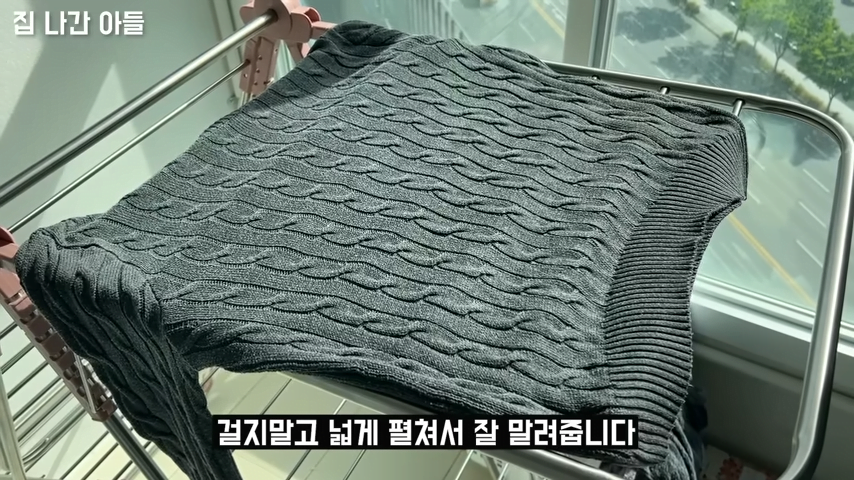 탈수가 끝난 니트는 꺼내주시고, 늘어나지 않도록 넓게 펼쳐서 잘 말려주세요.