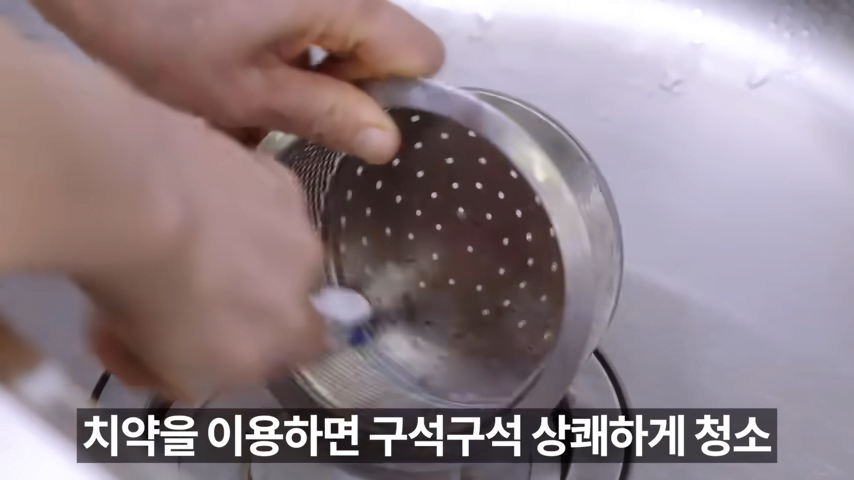 먼저 배수구 망에 붙은 음식물 쓰레기를 청소하고 치약을 이용해 깨끗하게 닦아주세요.