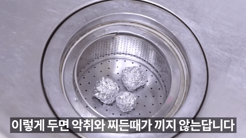 주방 배수구 망에 알루미늄 호일 공 3개를 넣으면 악취와 때가 생기지 않습니다.
