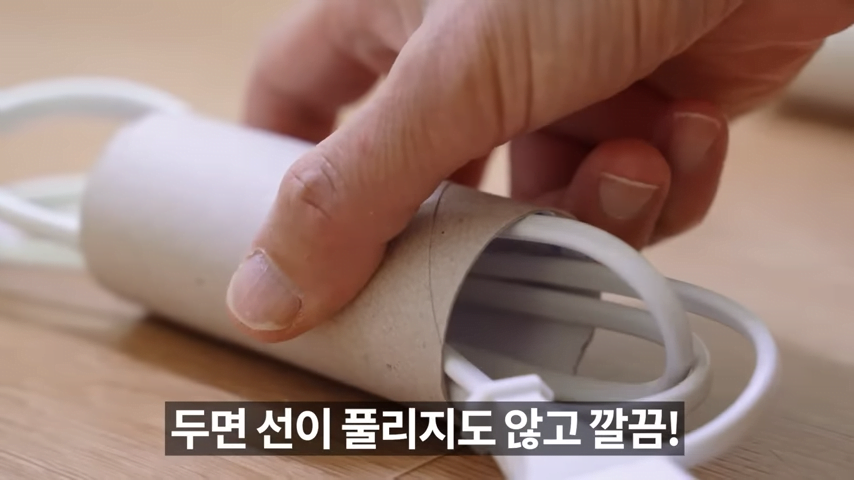 전기선을 적당한 간격으로 접어 휴지심에 넣으면, 선이 풀리지 않고 깔끔하게 정리됩니다.