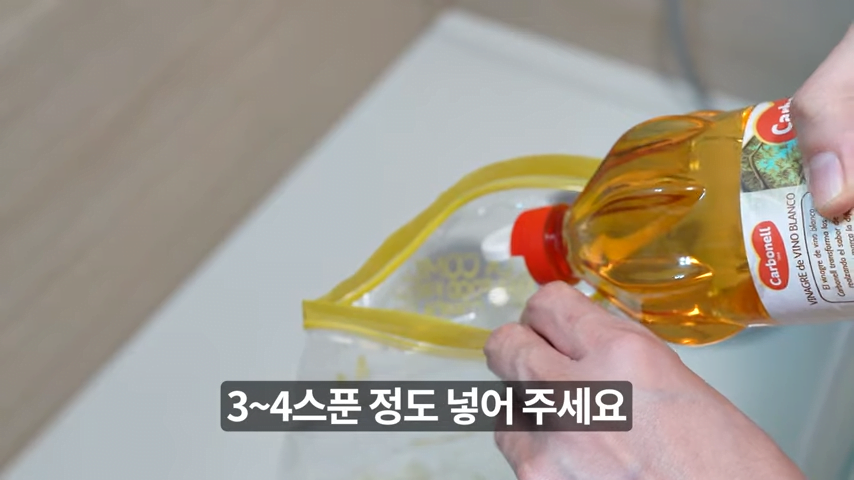 먼저 작은 지퍼백 하나를 준비하고, 식초를 세네 스푼 정도 넣어주세요.