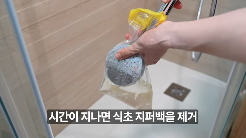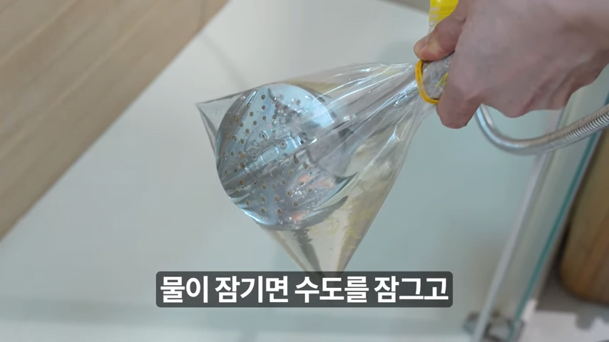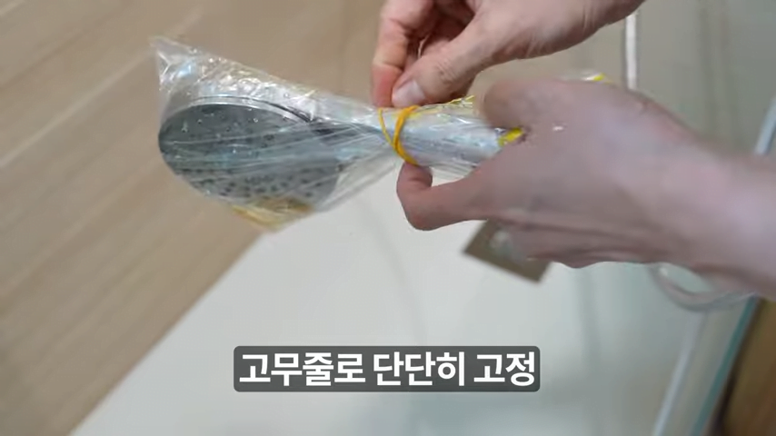물때가 가득한 샤워기나 수도꼭지에 준비한 지퍼백을 씌우고, 고무줄로 단단히 고정시켜주세요.