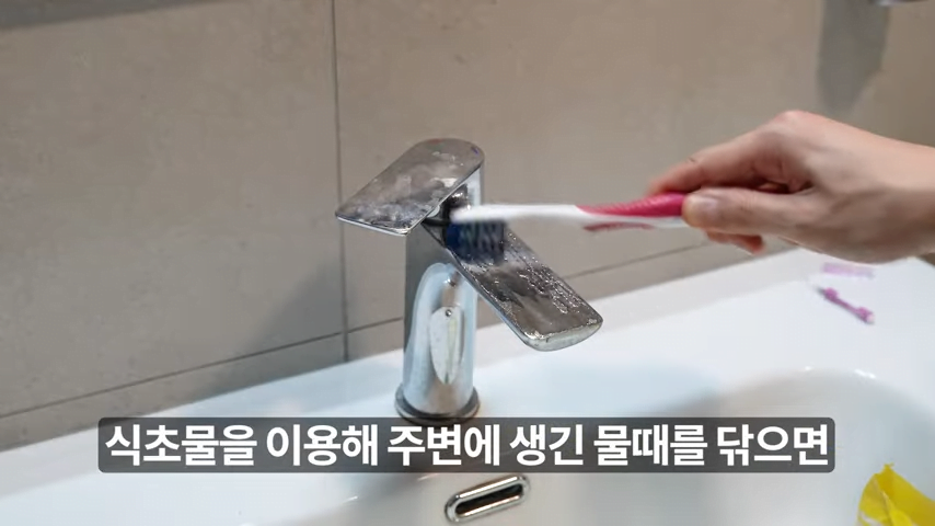 이제 입구에 물때를 닦아 줄 차례인데, 칫솔을 이용하면 좋습니다.