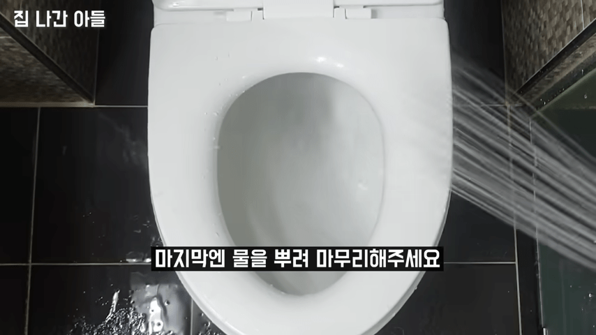 마지막으로 물을 뿌려 마무리하면, 변기가 깨끗해질 것입니다.
