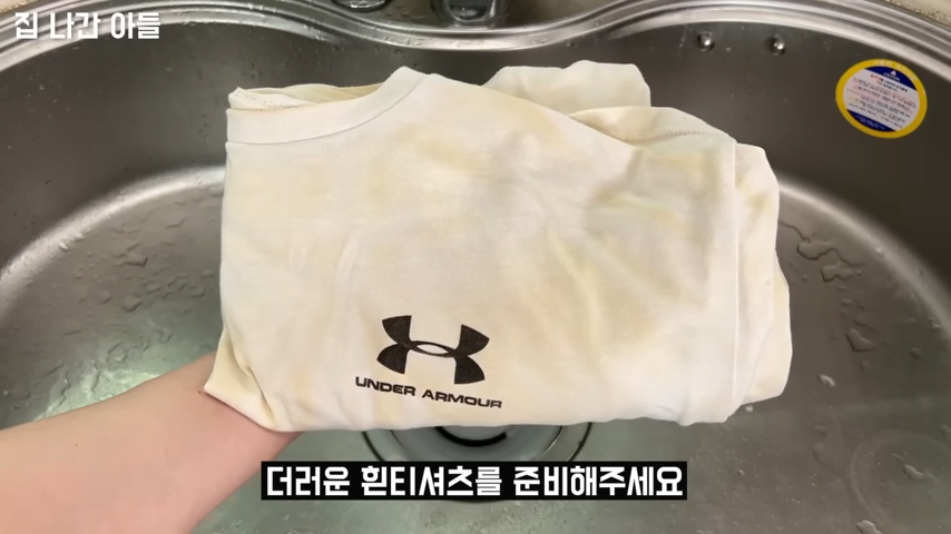 티셔츠에서 나온 더러운 물은 버리고, 티셔츠를 깨끗하게 헹궈 주세요.