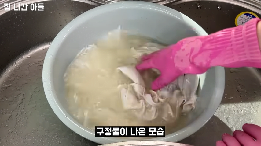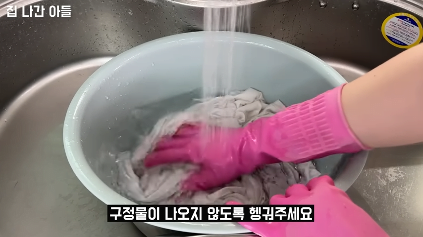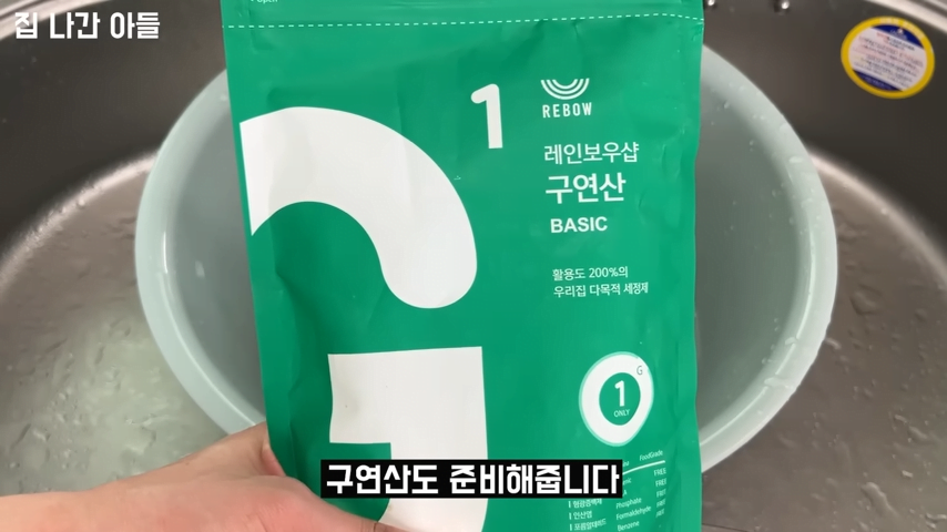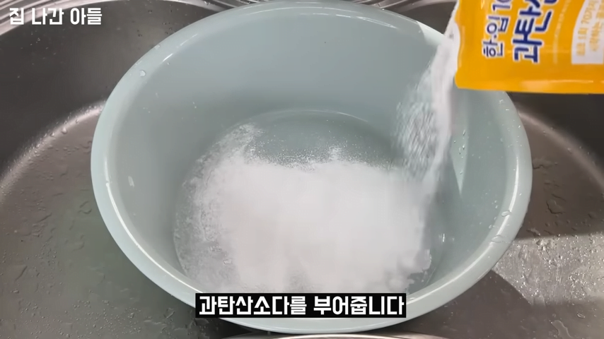 환기를 한 뒤에 과탄산 소다를 물에 넣고, 뜨거운 물을 부어 반응을 일으킨 후 세탁할 수 있는 상태로 만들어 주세요.