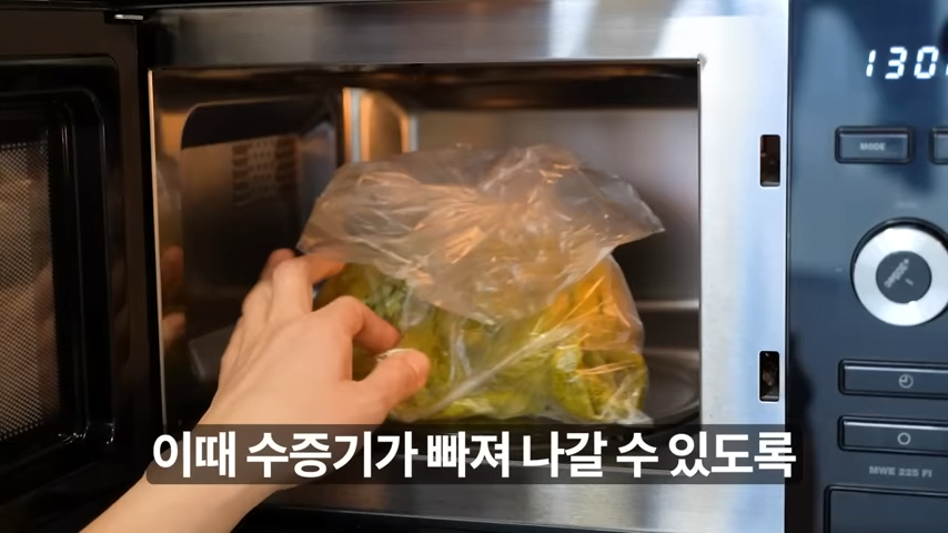 이제 전자레인지에 놓고, 수증기가 빠져나갈 수 있도록 비닐의 입구 부분을 약간 열어둡니다.