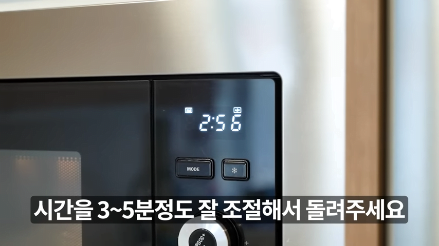 전자레인지의 와트 파워와 수건의 양에 따라 시간을 3에서 5분 사이로 조절해주세요.