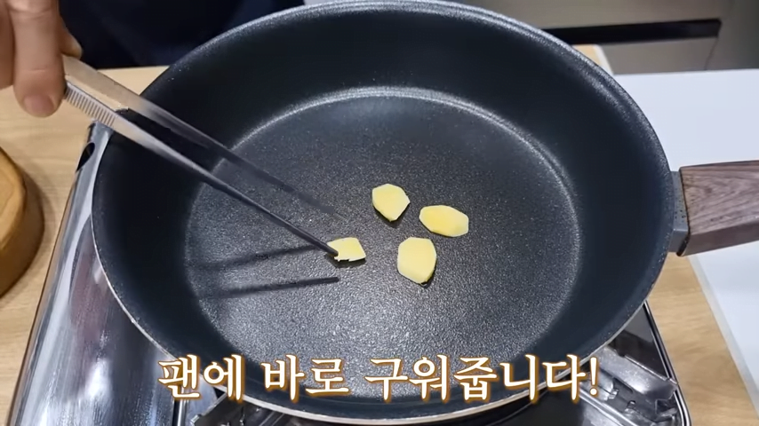 1/4의 생강을 바로 구웁니다. 이렇게 생강을 구워 사용하면 쓴맛이 사라지고 고급진 맛이 느껴집니다.