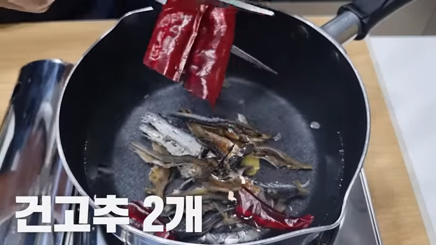 매운맛을 좋아하신다면, 건고추 2개를 넣어주세요. 그 후, 가스 불을 켜주세요.