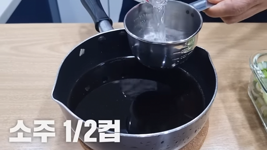 간장이 다 식었으면, 200ml에 소주 반 컵만 넣으면 간장 본이 완성됩니다. 한 번 섞어주시고 바로 붓도록 해주세요.
