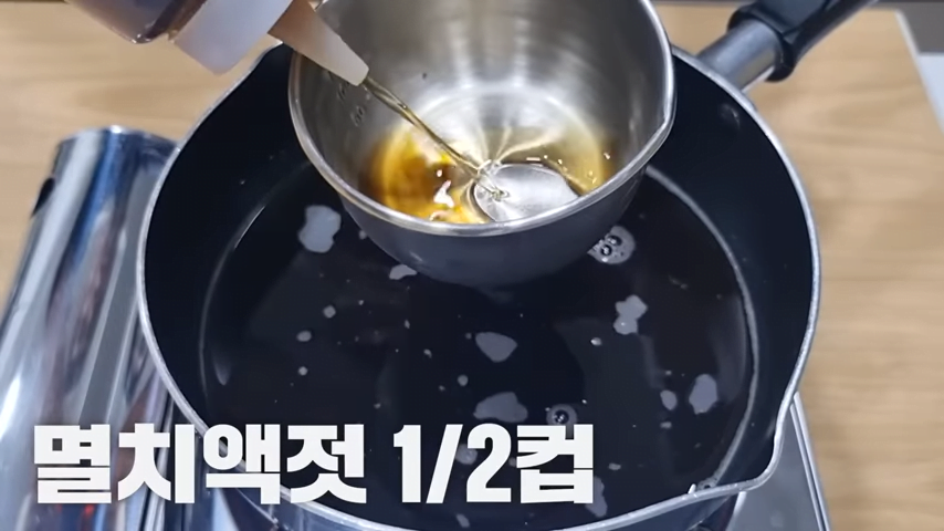부스러기를 모두 빼낸 후에는 다시 불을 세게 올리고 진한 간장 1컵 (200ml), 멸치액젓 반컵 (100ml), 설탕 3스푼을 넣어주세요.