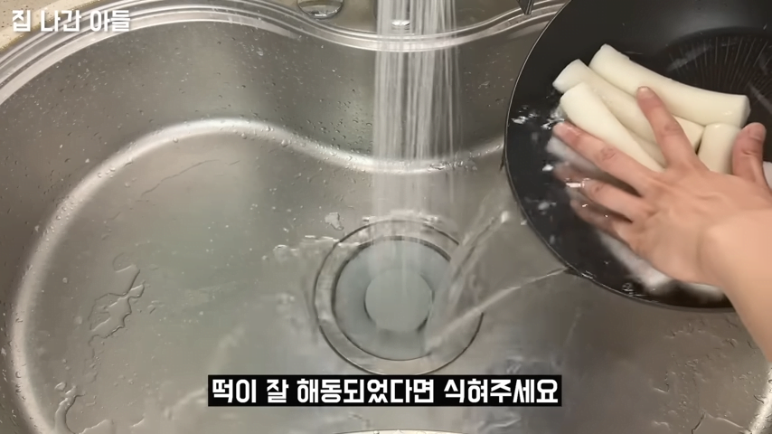 떡이 적당히 말랑해졌을 때, 차가운 물에 넣어 식히면 해동이 완료됩니다.