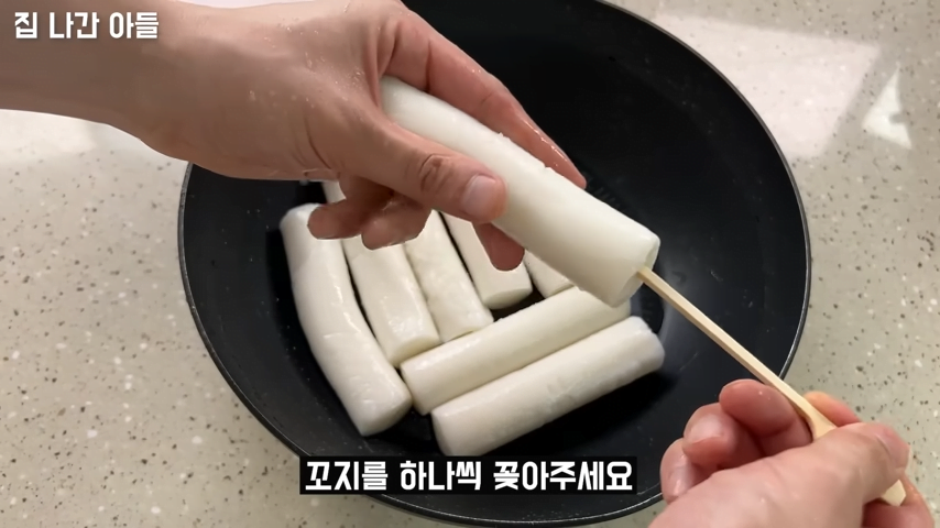 해동된 떡에 꼬지를 꽂으면 나중에 먹을 때 편리합니다. 이 단계는 필수는 아니지만, 더 편리하게 먹을 수 있는 작은 꿀팁입니다.