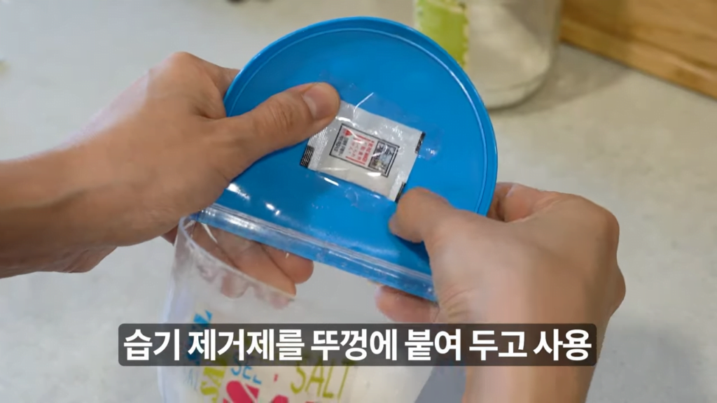 소금, 설탕 등의 조미료는 습기로 인해 딱딱하게 굳기 쉬운데, 습기 제거제를 뚜껑에 붙여두면 이를 방지할 수 있습니다.