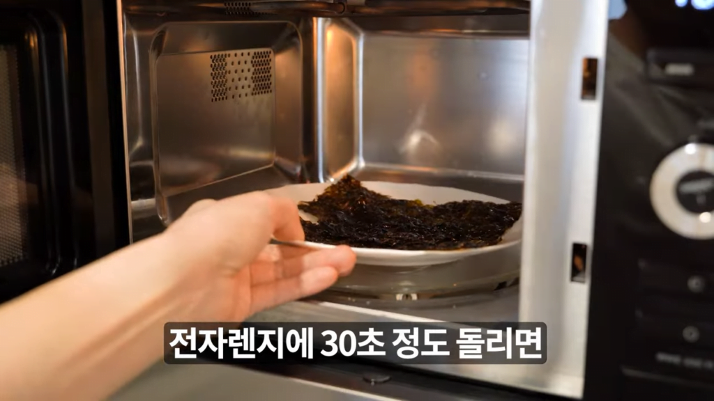 접시에 김을 한 장씩 올려두고 전자렌지에 30초 돌리면, 전자렌지가 김의 수분을 흡수하여 다시 바삭바삭한 김을 먹을 수 있습니다.