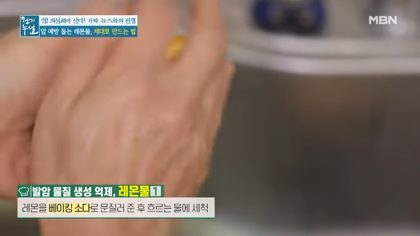 레몬은 껍질까지 활용하기 때문에, 베이킹소다로 잘 문지른 다음 흐르는 물로 씻습니다.
