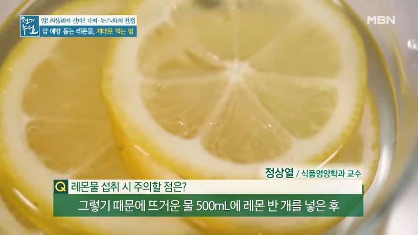 레몬에 있는 성분이 위산을 조절하고, 몸의 노폐물을 제거하며, 피 순환을 돕기 때문입니다. 따라서 하루에 두 번, 각각 500ml씩 마시는 것이 좋습니다.