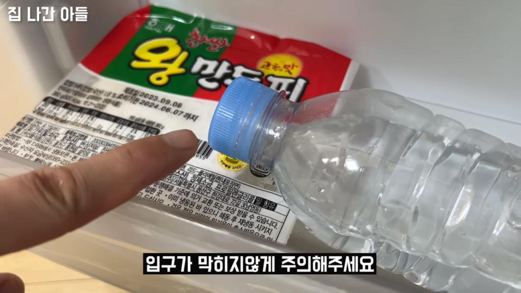 그 후 생수병을 기울여 물이 입구 부분만 막히지 않도록 얼려줍니다.