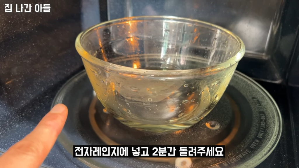 식초와 물을 1:1 비율로 섞어 전자레인지용 용기에 담고 약 2분간 돌립니다.