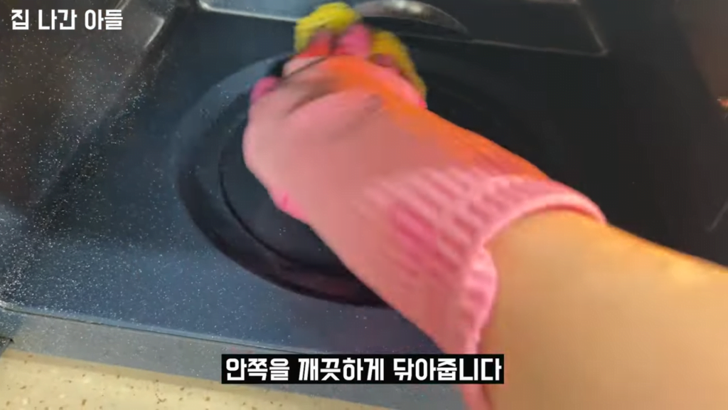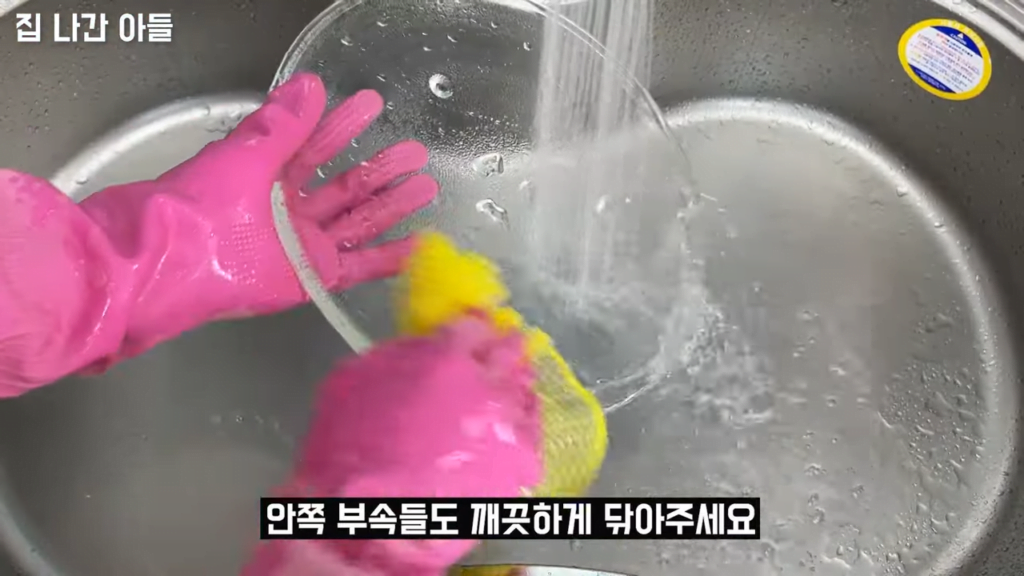 내부 부속품을 꺼내어 수세미에 식초물을 묻혀 닦아줍니다.
