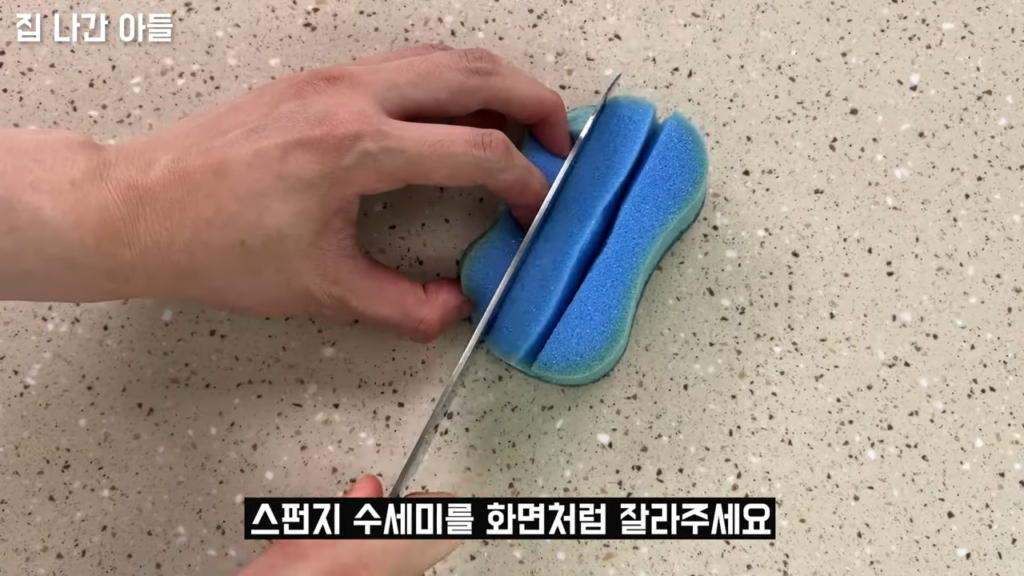 먼저 첫 번째로 스펀지 수세미를 준비한 뒤에 사진처럼 잘라 주세요.
