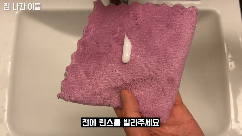 부품이 다 말랐다면 깨끗한 천에 린스를 짜내 주시고요. 천에 넓게 펴바른 뒤에 선풍기 날개를 닦아 줄 겁니다.