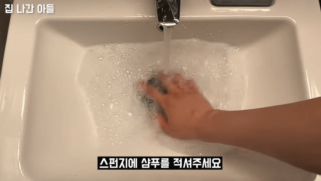 선풍기 분리가 끝났다면 물에 샴푸를 살짝 풀어 주세요.