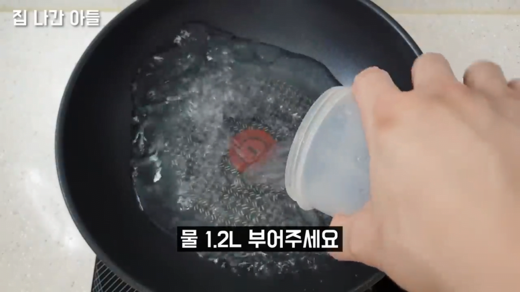 먼저 물 1.2L를 부어 주시고요, 다시마나 다시 팩을 이용해서 육수를 내줍니다.