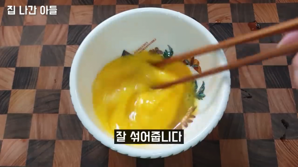 육수를 올리는 동안 계란 2개를 풀어 주시고요, 노른자와 흰자를 잘 섞어줍니다.