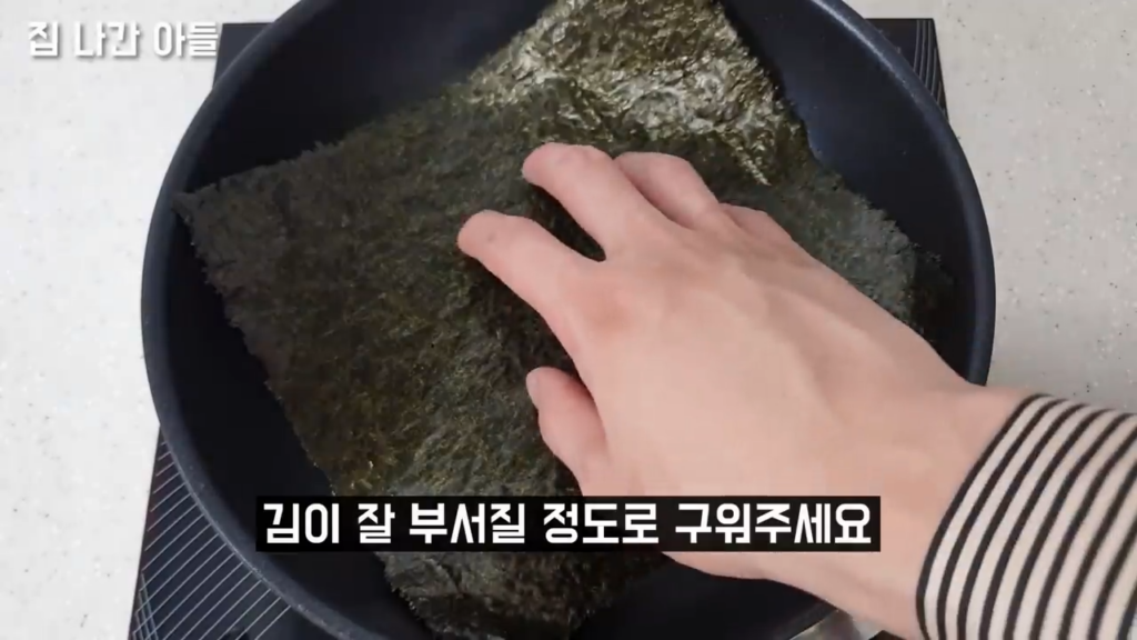 재료 준비가 끝났으면 프라이팬에 김을 구워 주시고요, 특별한 방법 없이 김이 잘 부서지게 따끈할 정도로만 구워주시면 됩니다.