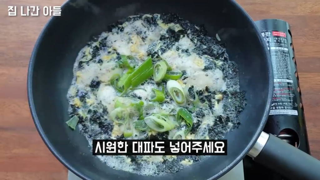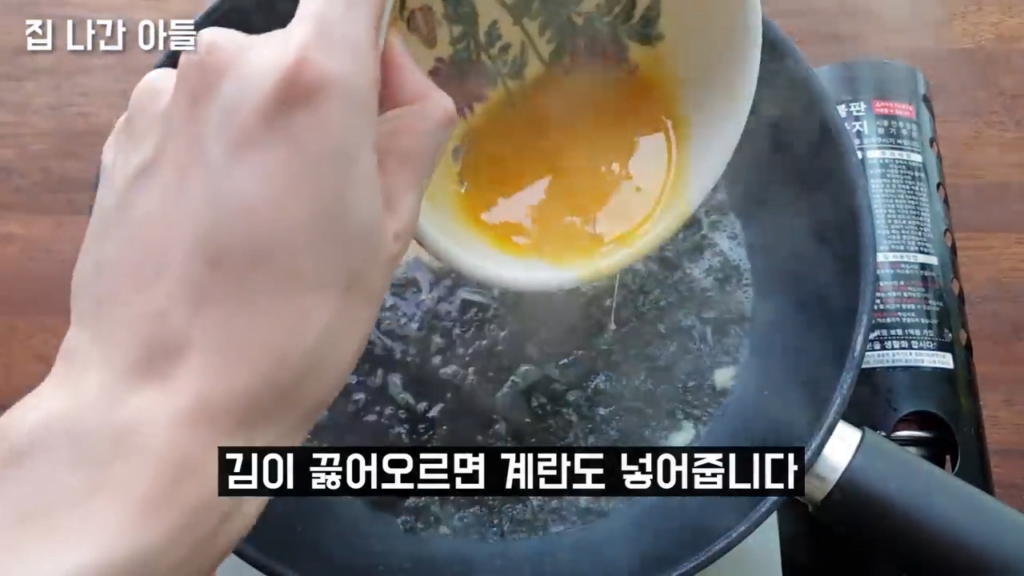잘 구워냈던 고소한 김도 넣으시고요, 이제 좀 더 끓어오르면 담백한 계란도 넣어줍니다.