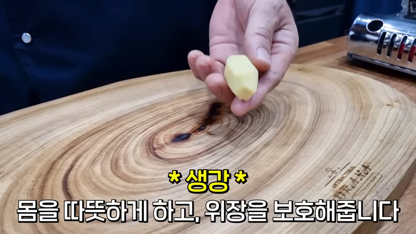 우리는 한 톨의 생강을 사용할 거에요. 생강은 몸을 따뜻하게 하고, 위장을 보호하는 데에도 도움이 되는 친구랍니다.