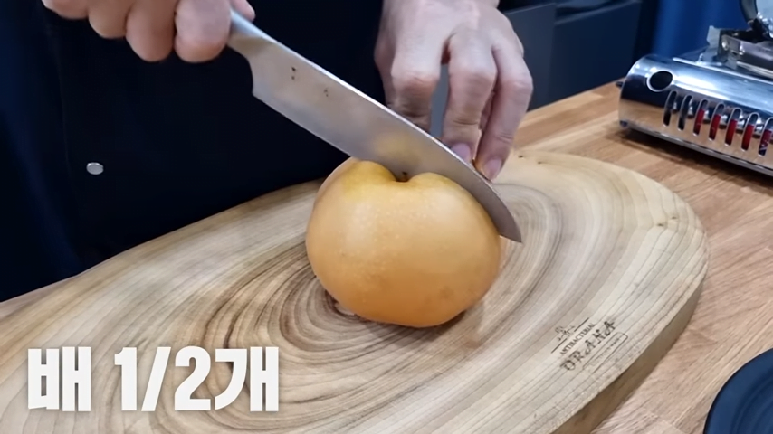 우리는 깨끗이 씻은 한 개의 배를 준비했지만, 절반만 사용할 거예요.