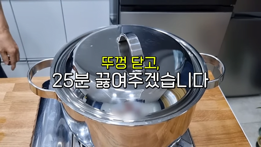 뚜껑을 닫고 25분 동안 끓이겠습니다.
