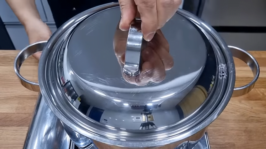 그리고 다시 뚜껑을 닫아요. 가스불을 끄고, 뚜껑을 닫은 상태로 20분 동안 뜸을 들이죠.