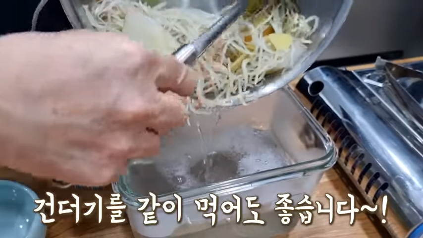 20분 동안 뜸을 들였다면 내열용기에 건더기와 함께 담아줍니다.