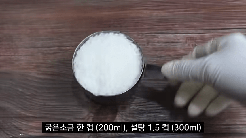 지퍼백에 굵은 소금 한 컵 (200ml)과 설탕 1.5 컵 (300ml)을 넣어주세요.