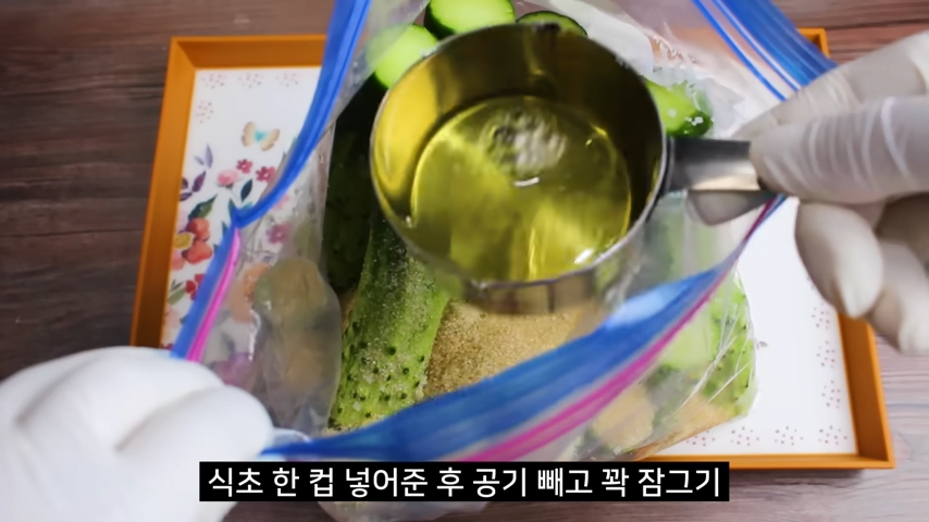 식초를 한 컵 넣은 후, 공기를 빼고 꽉 잠궈주세요.