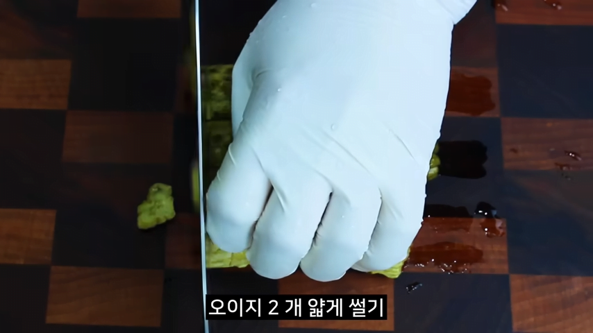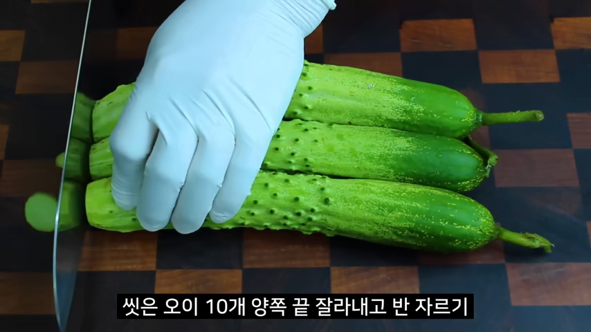 10개의 씻은 오이의 양쪽 끝을 잘라내고 반으로 자릅니다.