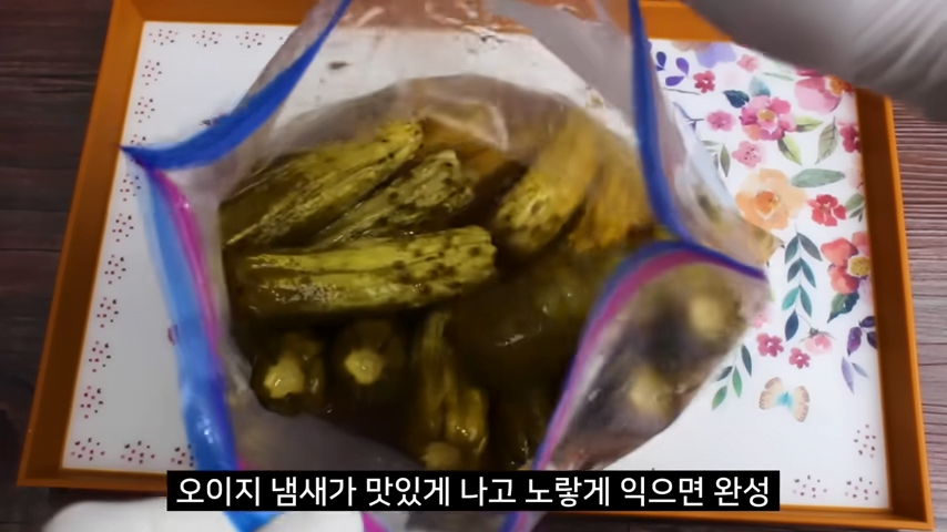 오이지가 맛있는 냄새를 내고 노랗게 익었을 때 완성됩니다.