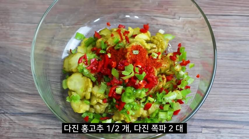 고춧가루 반 스푼, 올리고당 한 스푼, 다진 청양고추 한 개, 다진 홍고추 반 개, 다진 쪽파 2 대를 넣어줍니다.
