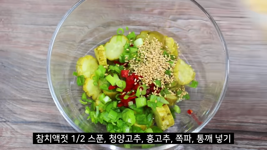 그릇에 썰은 오이를 담고, 참치액젓 1/2스푼, 청양고추, 홍고추, 쪽파, 그리고 통깨를 넣어줍니다.