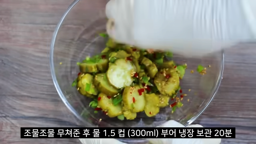 조물조물 무쳐준 후, 물 1.5컵(300ml)을 부어 냉장보관 20분 동안 보관해줍니다.