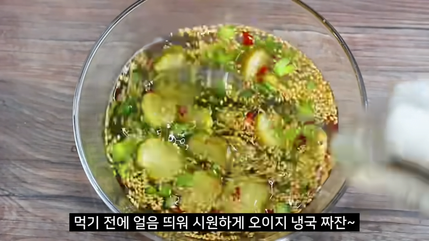 먹기 전에 얼음으로 시원하게 만든 오이지냉국이 완성됩니다.