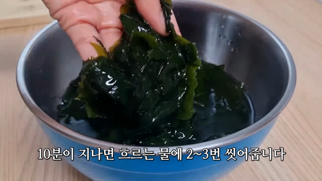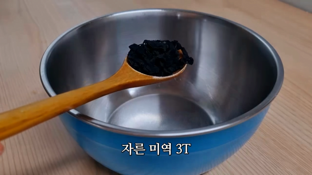 자른 미역 3스푼을 물에 10분간 담가두세요.