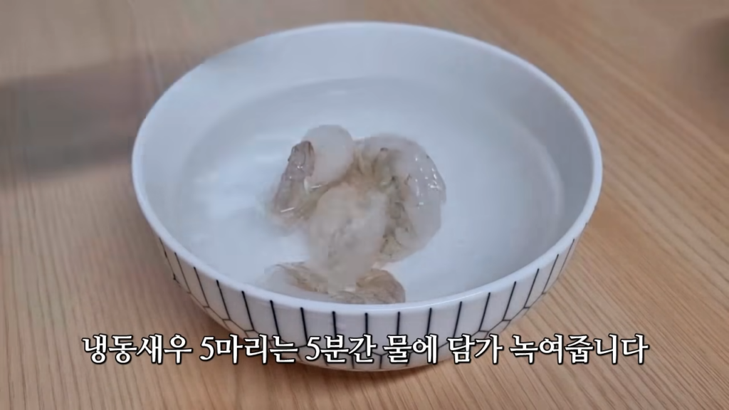 5마리의 냉동새우는 5분 동안 물에 담가 녹입니다.