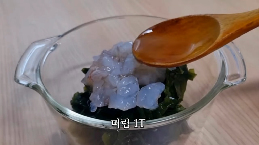 전자렌지 용기에 미역과 새우를 넣고, 미림 1T와 약간의 후추를 넣어서 밑간을 합니다.