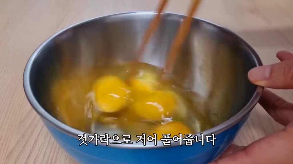 두부 70g은 으깨줍니다. 달걀 3개를 넣고, 젓가락으로 저어 풀어줍니다.