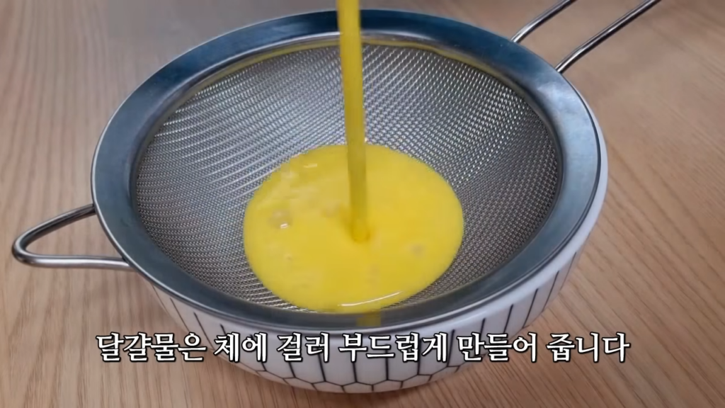 달걀물은 체로 걸러 부드럽게 만들어 줍니다. 그 다음에, 미역에 달걀물을 부어줍니다.